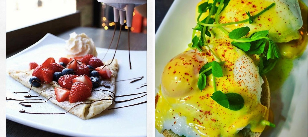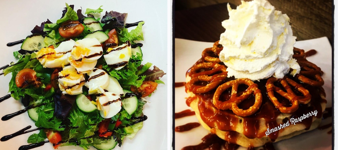 Smashed Raspberry serves a range of dishes, including sweet and savory crêpes, waffles, American pancake stacks, shakes, paninis, toasted wraps, jacket potatoes, and omelettes.