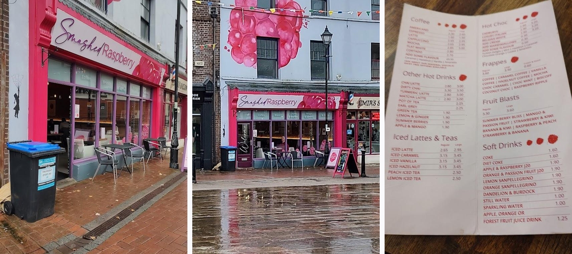 Smashed Raspberry boasts a fantastic coffee selection, great teas, and delicious hot chocolate, perfect for a cozy afternoon treat.